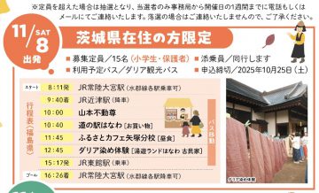 1日目 | (水郡線各駅乗車)ーJR近津駅(9:40着)=山本不動尊=道の駅はなわ=ふるさとカフェ矢塚分校(昼食)=ダリア染め体験=JR東館駅(15:17発)ー(水郡線各駅降車) ※当日の天候や交通状況により変更になることもございますので、予めご了承ください。 |