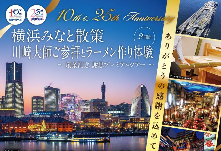 [ 1泊2日 ] 横浜みなと散策川崎大師ご参拝ラーメン作り体験2日間~創業記念謝恩プレミアムツアー~第14回イキイキツアー ~ありがとうの感謝を込めて~ 46,500円~