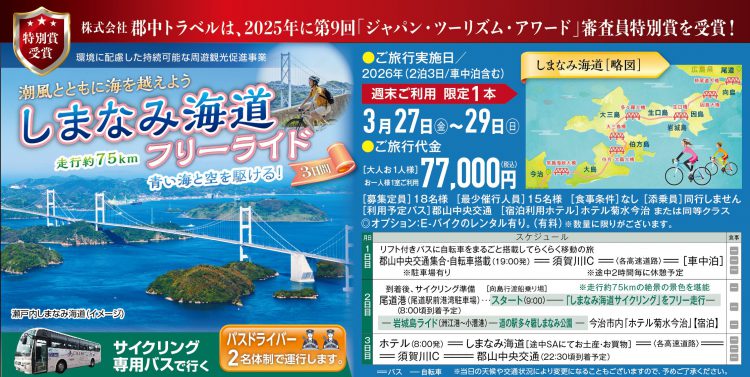 [ 2泊3日(車中泊含む) ] サイクリストのあこがれしまなみ海道フリーライドサイクリング専用バスで行く!「しまなみ海道」フリーライド