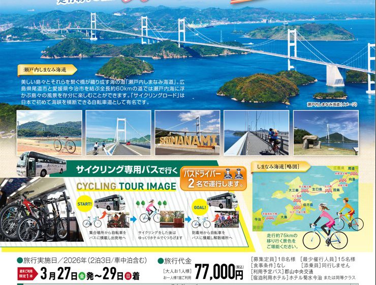 サイクリング専用バスで行く!「しまなみ海道」フリーライド 走行約75㎞の移り行く景色をご堪能ください♪