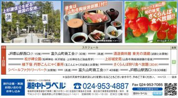 | 1日目 | 郡山駅(7:15発)=富久山商工会(7:30発)=酒造資料館 東光の酒蔵(試飲とお買物)=松が岬公園(松岬神社、米沢神社、上杉神社など自由見学)=上杉城史苑/昼食=楢下宿丹野こんにゃく番所(玉こんにゃくの試食とお買物)=斎藤観光果樹園/さくらんぼ狩り(食べ放題30分)=シベールファクトリーパーク(お買い物)=富久山商工会(17:40頃着)=郡山駅(18:00頃着) |