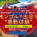【まもなく募集開始(告知)】福島県は11月12日、福島空港とモンゴルを結ぶ国際チャーター便が2026年5月に運航されることになったと発表運航が決まったのは、モンゴル・ウランバートルのチンギス・ハーン国際空港へのチャーター便で、2026年5月2日から6日に運航予定。今のところ、福島空港を出発してモンゴルに行き、福島に帰ってくるという1往復(計2便)の運航が決まっているという。発着時間は調整中で、今後、旅行商品として販売される予定。モンゴルとのチャーター便は2019年8月以来。福島県は「台湾やベトナムなど、福島空港からの国際チャーター便が多く就航している場所はもちろん、そのほかの国や地域に向けても就航範囲を広げていきたい」としている。 -